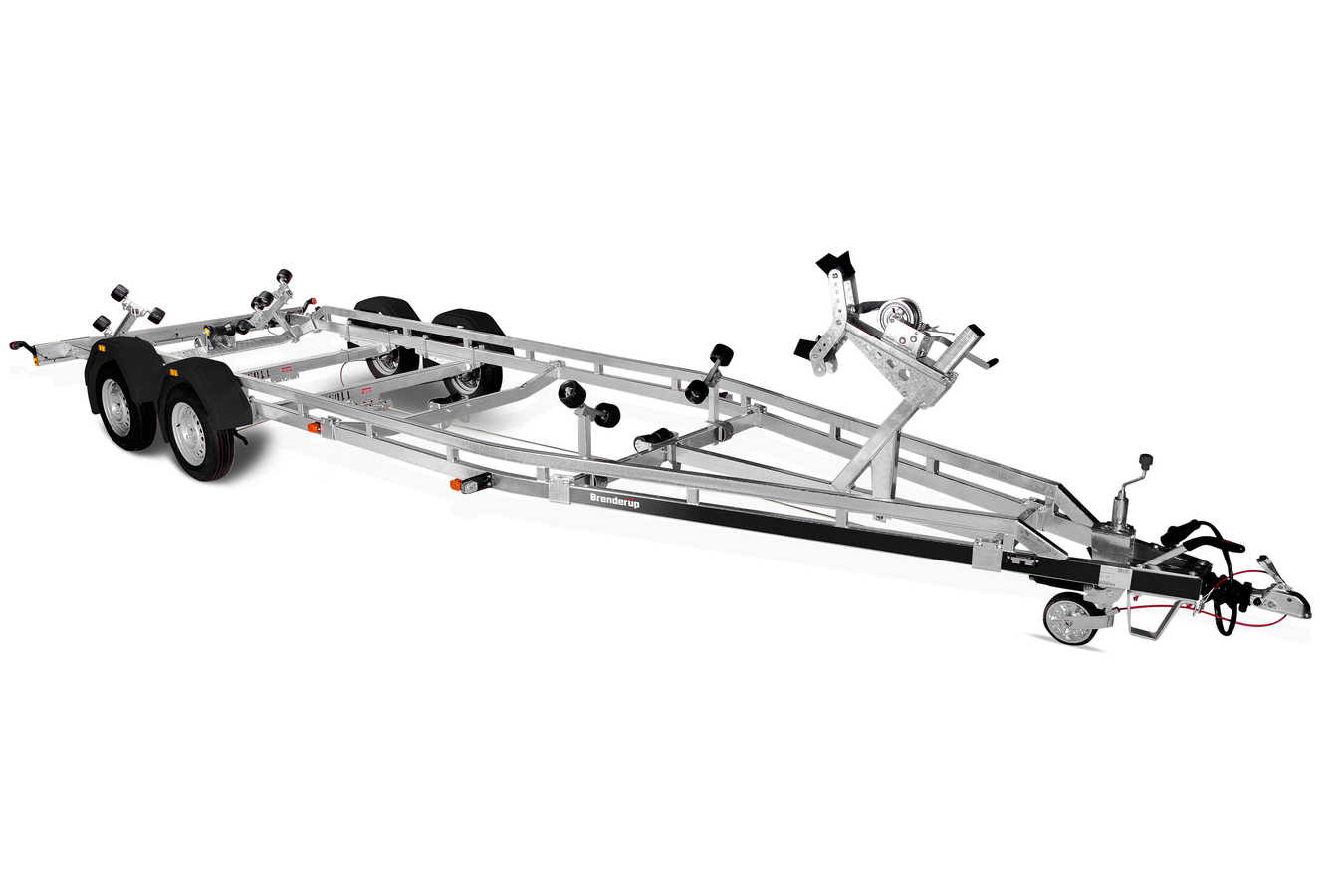 Bremset trailer med to aksler til både op til 24 fod. Traileren er udstyret med et forstærket V-formet chassis. Udstyret med superruller, forstærkede kølruller og justerbare dobbelte sideruller, som gør det nemt for dig at tilpasse traileren til din båd. Varmgalvaniseret chassis og vandtætte lejer for længere levetid og maksimal beskyttelse mod rust. Kablerne ligger beskyttet i trailerens chassis. Justerbart spil og spiltårn. Lygtebommen sikrer let og hurtig søsætning af din båd, og lygtebommen kan opbevares i bilens bagagerum under sejlturen. Traileren på billedet kan være vist med ekstraudstyr.