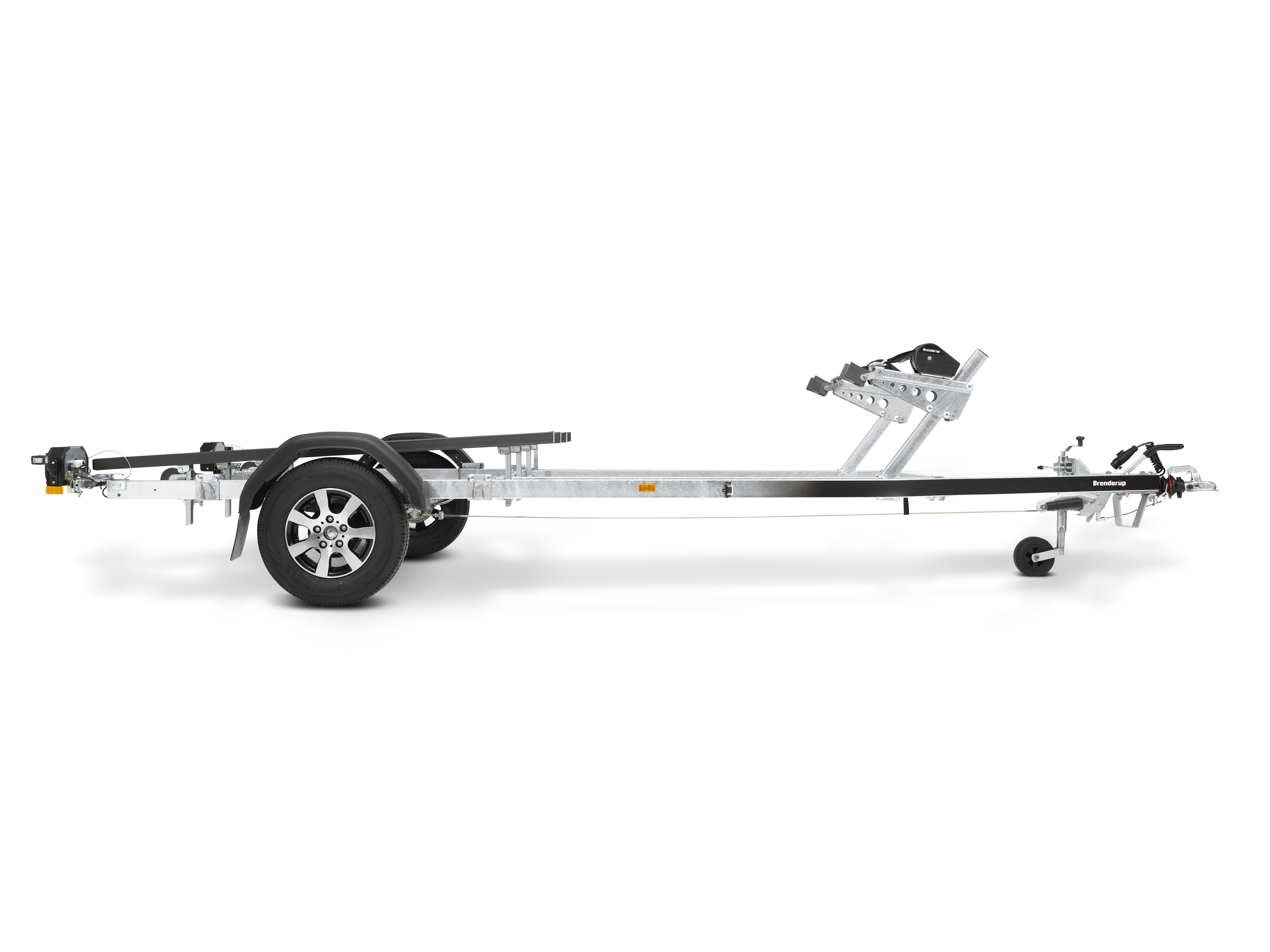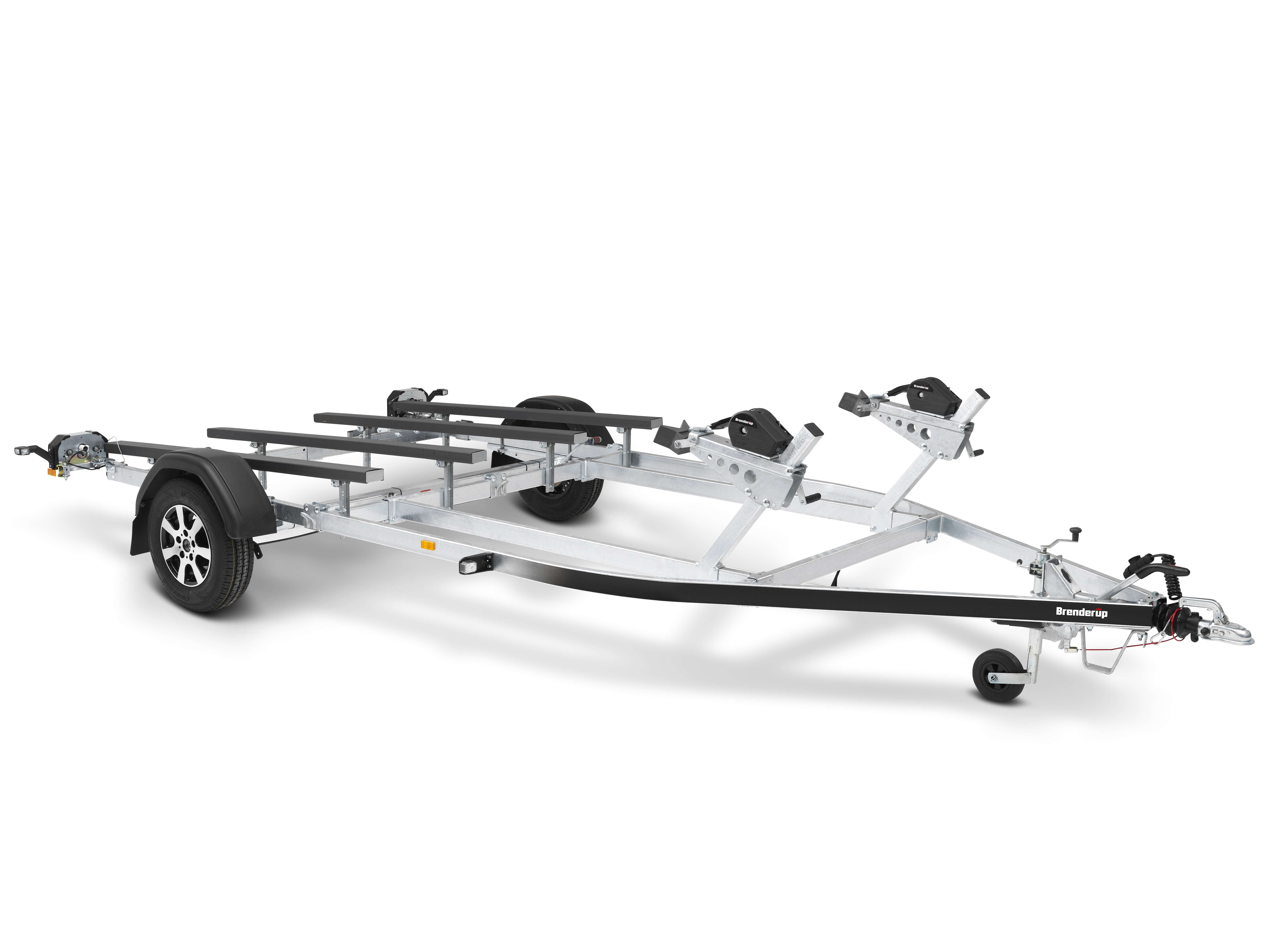Trailer til to vandscootere med mulighed for transport af en vandscooter også. Trailerens skinner er beklædt med et unikt materiale, som sikrer lav friktion og nem søsætning af dine vandscootere. Justerbare skinner og de dobbelt multijusterbare spiltårn gør det let for dig at tilpasse traileren til dine vandscootere. Skinnerne kan også let justeres til transport af en enkelt vandscooter. Seks justerbare surringsøjer er inkluderet. Vandtætte lejer og spulesystem til rengøring af bremserne er standard. Traileren på billedet kan være vist med ekstraudstyr.