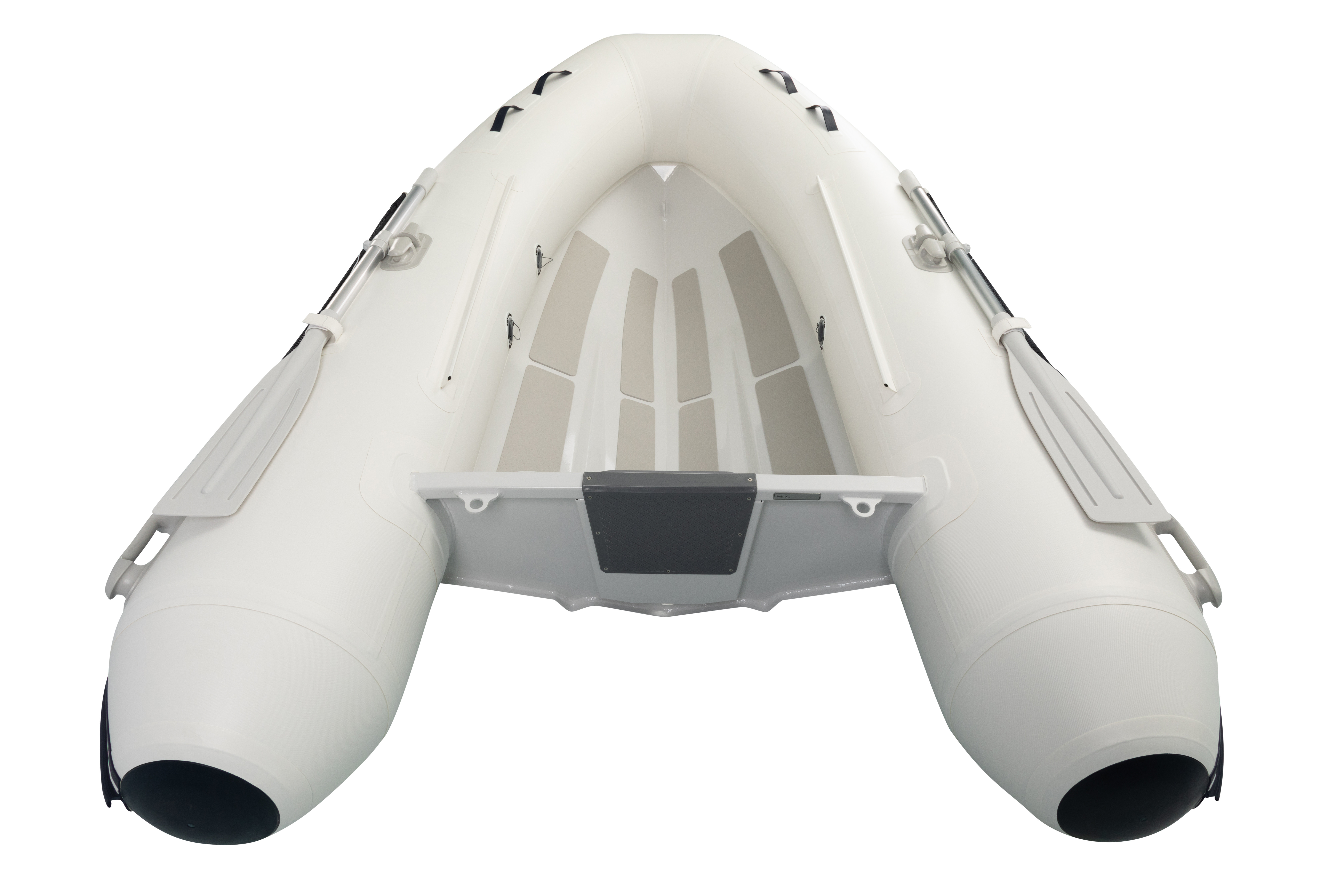 Udarbejdet i kraftig PVC med aluminiums RIB monteret med anti-skrid pads på den V-formede dørk for større sikkerhed ombord. Justerbar bænk, fortøjningsringe på ydersiden samt flere bærehåndtag.